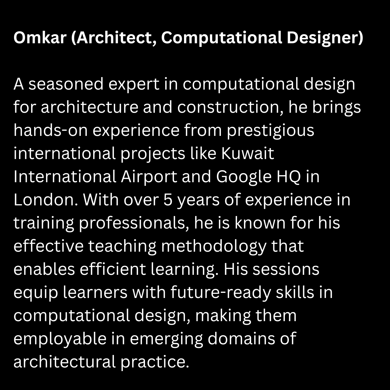 This masterclass delves into the technical and design aspects of architectural lighting, covering principles of illumination, lighting types, lux level standards, and spatial analysis. The session also introduces industry-relevant tools for simulation, analysis, and documentation